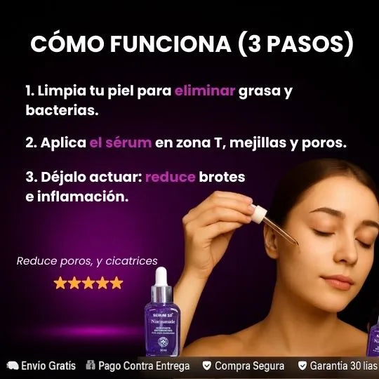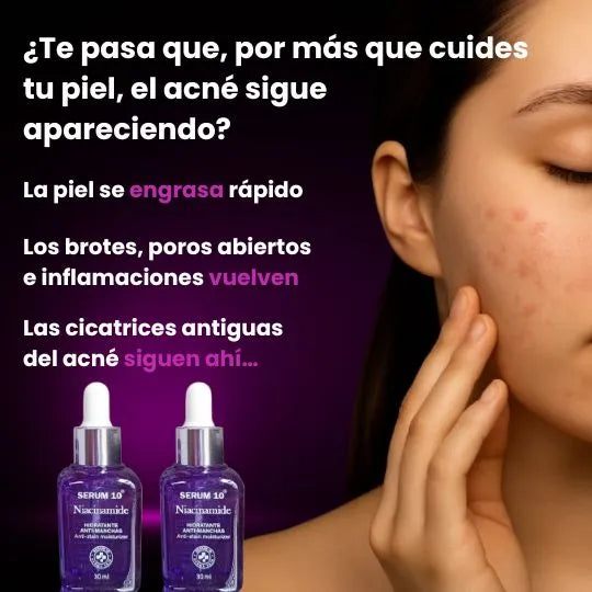 Es un sérum con Niacinamida al 10%, diseñado para regular la grasa, reducir brotes, disminuir poros visibles y mejorar la textura general de la piel.